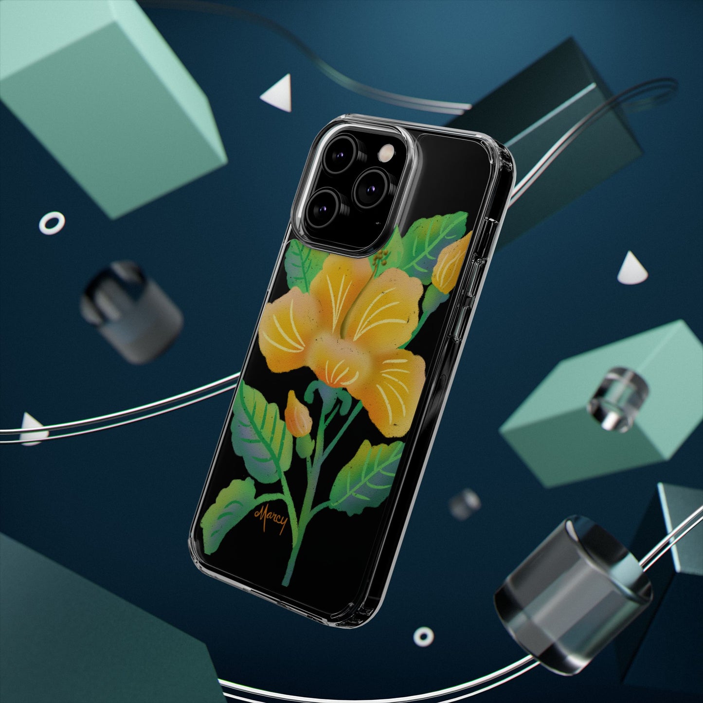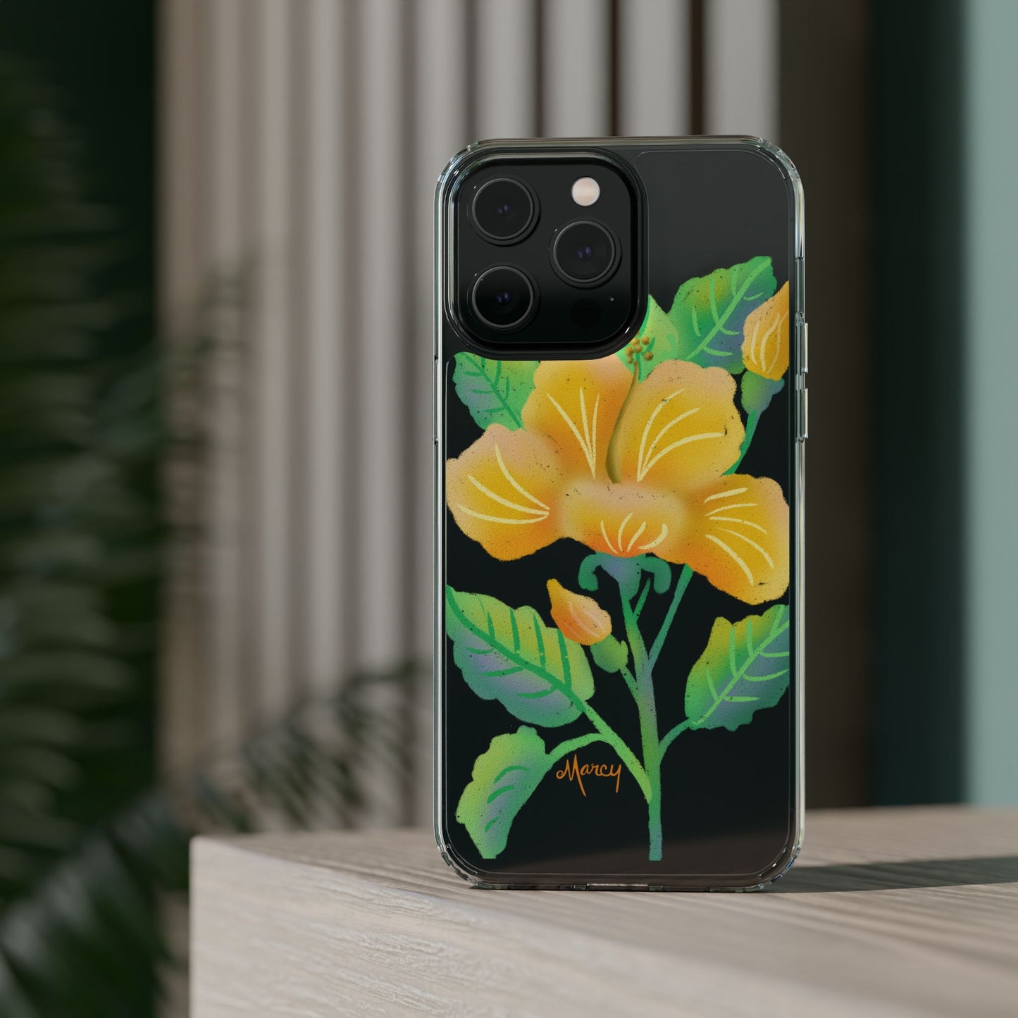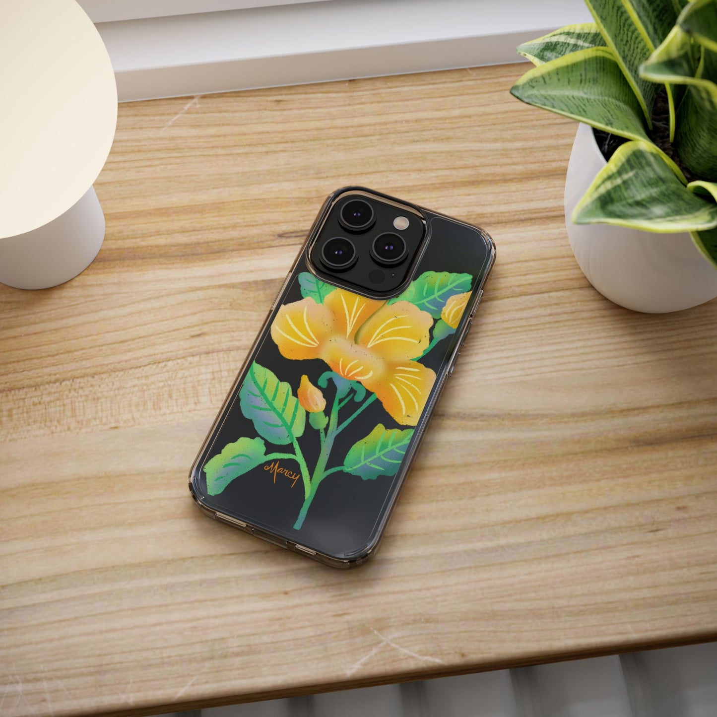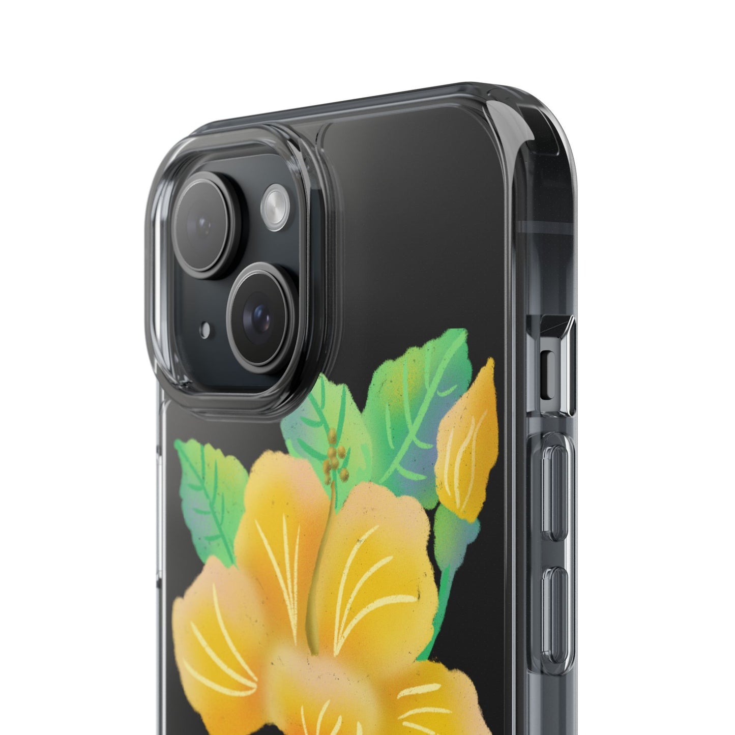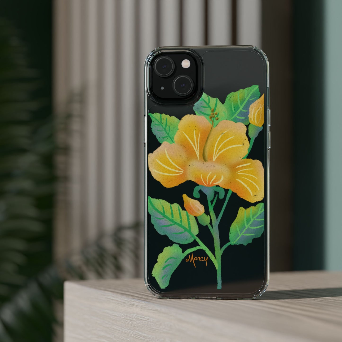 Bring the tropics to your everyday with this pretty yellow hibiscus blossom. This clear phone case comes to protect both your phone's surface and its aesthetics. The crystal clear polycarbonate case is flexible, crack and chip-resistant, as well as co-molded with TPU cushioned edges on the side. This gives protection against scratches and minor bumps while still keeping your phone's slim profile intact. Each case features open ports for hassle-free connectivity.